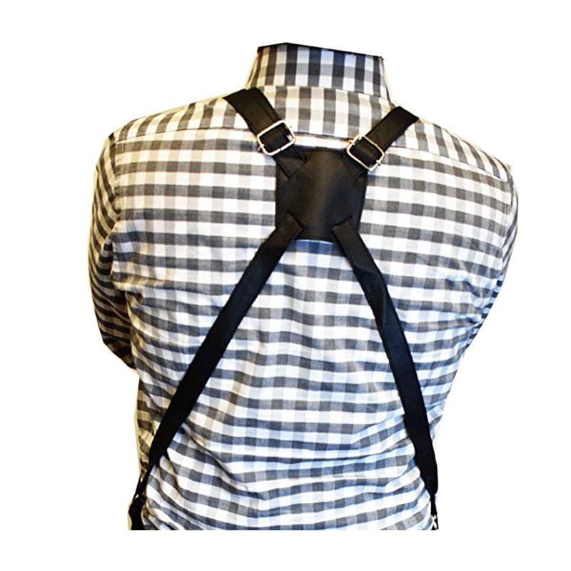 Features: Multiple pockets, adjustable suspenders, length in inches.